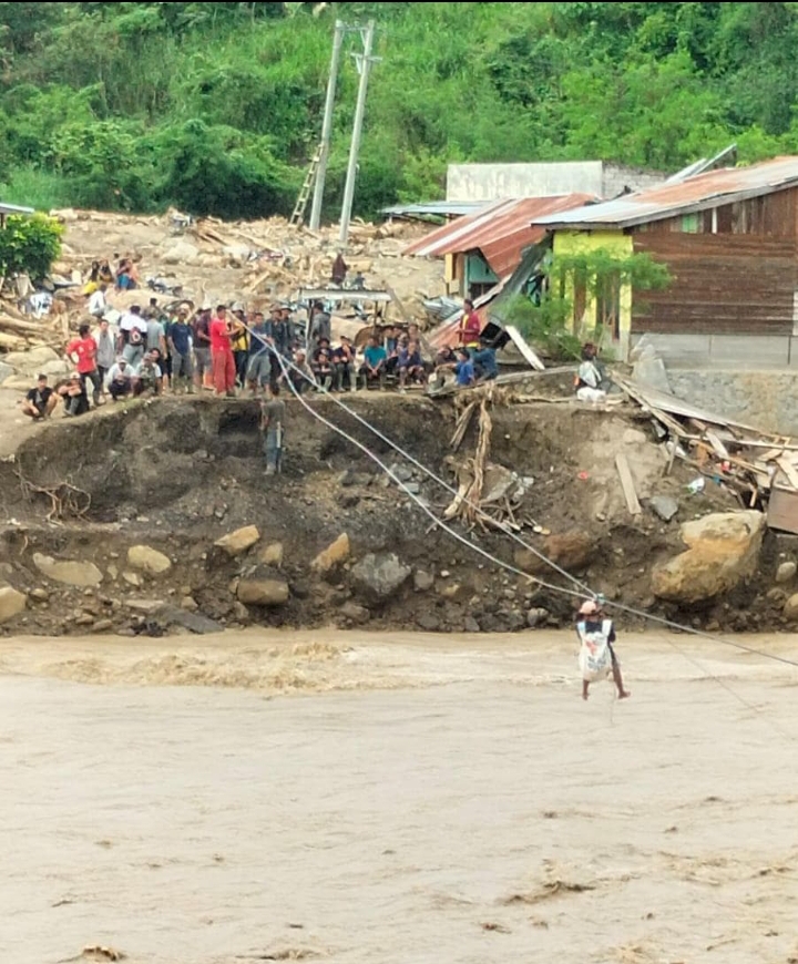 Dalam foto yang beredar, terlihat warga berusaha menyeberangi sungai dengan bantuan tali darurat, sementara puluhan warga lainnya berkumpul di tepi sungai menyaksikan proses evakuasi. Beberapa bangunan rumah tampak rusak parah, sebagian roboh dan terseret arus, menyisakan puing-puing kayu dan material bangunan.