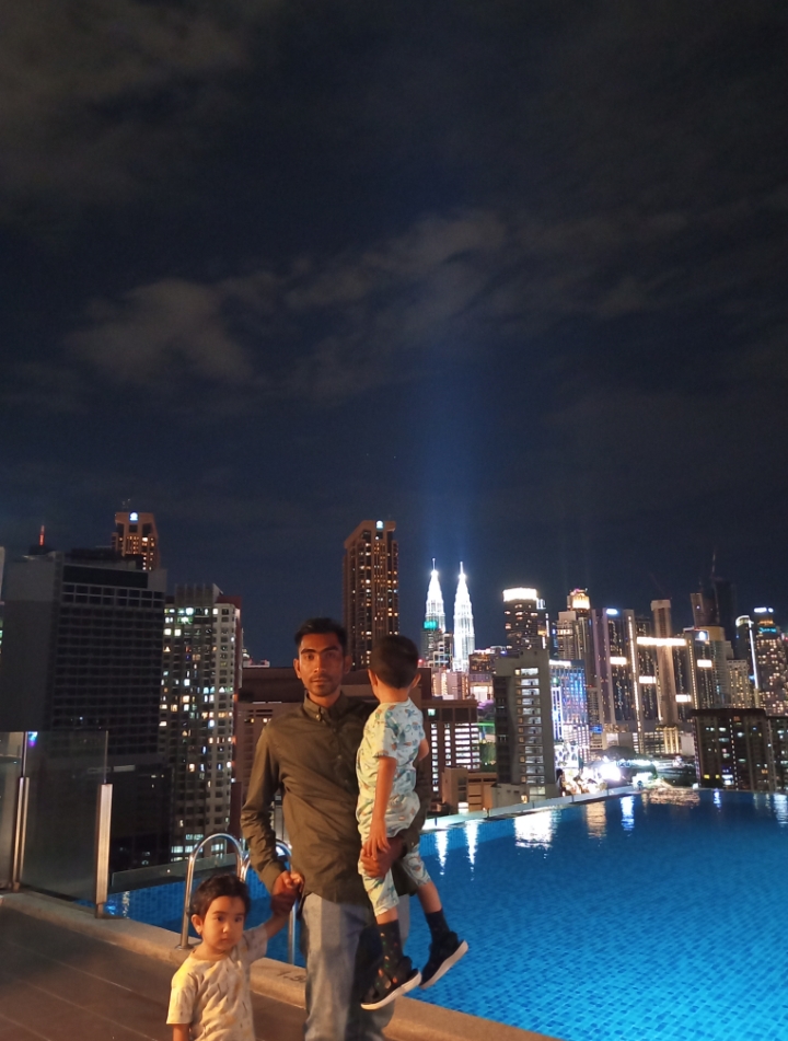 Tidak hanya mereka, banyak tamu lain juga tampak menikmati malam dengan berenang di kolam renang yang terletak di atas gedung. Air kolam yang jernih dan udara malam yang sejuk membuat suasana terasa sangat menyenangkan. Lampu-lampu kota yang berkilauan menjadi latar sempurna bagi siapa pun yang ingin melepas penat setelah seharian beraktivitas di jantung Kuala Lumpur.