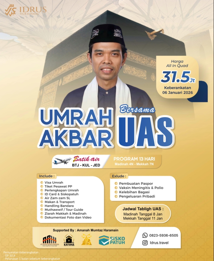 Daftar sekarang untuk Umrah Akbar Bersama Ustaz Abdul Somad (UAS), keberangkatan 6 Januari 2026 bersama Idrus Travel. Harga all in Rp31,5 juta, fasilitas lengkap, dan jadwal tabligh UAS di Madinah & Mekkah